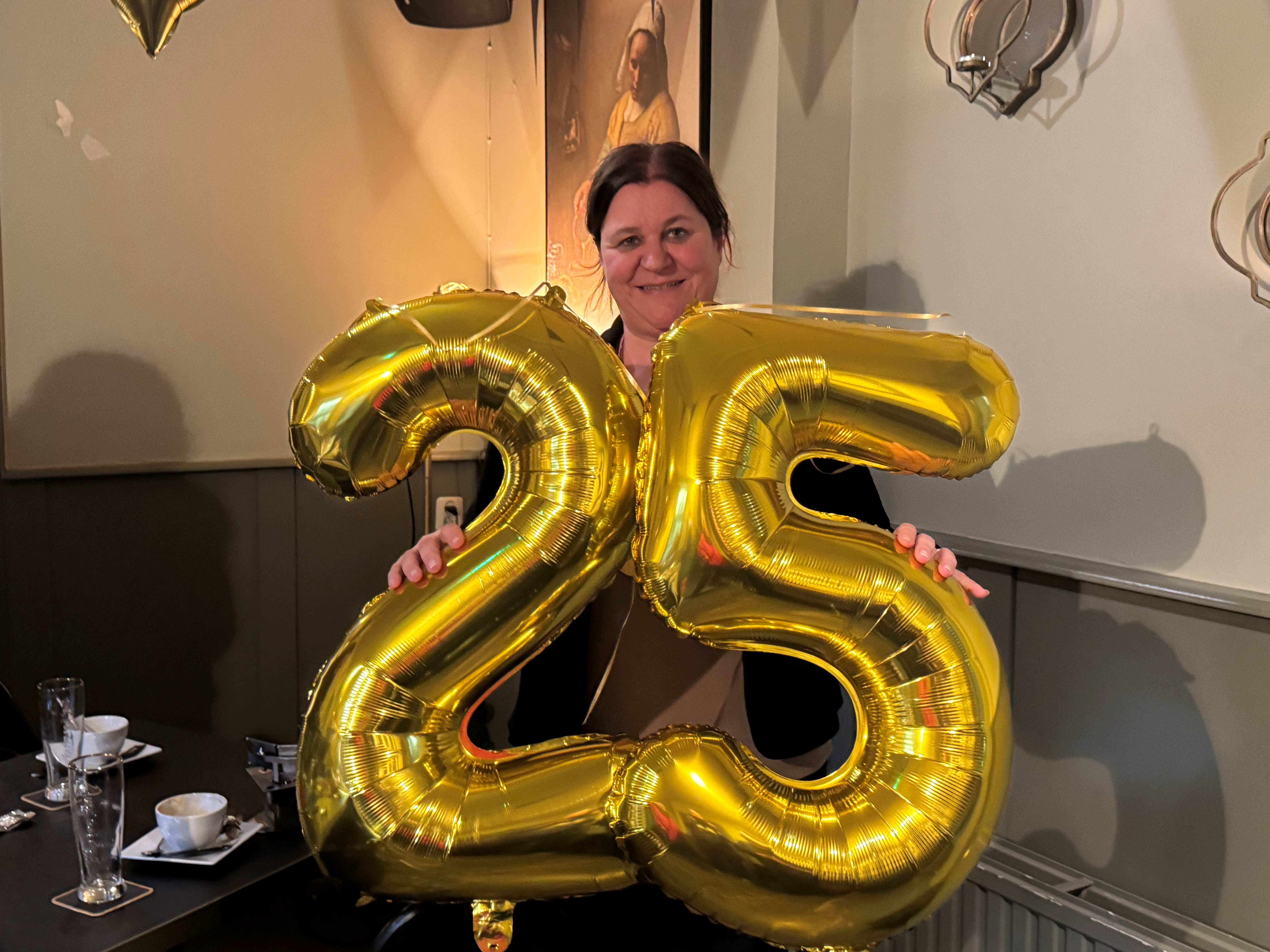 We hebben dit jubileum vorige week met z'n allen gevierd met een aangeklede borrel waarbij haar man Ruben en kinderen Thijs en Anne ook aanwezig waren. Daarbij waren foto's van en verhalen over de afgelopen 25 jaar een uitgebreid onderwerp van gesprek. Anneke, bedankt voor jouw inzet in de afgelopen 25 jaar! We hopen je nog heel lang in ons midden te hebben.